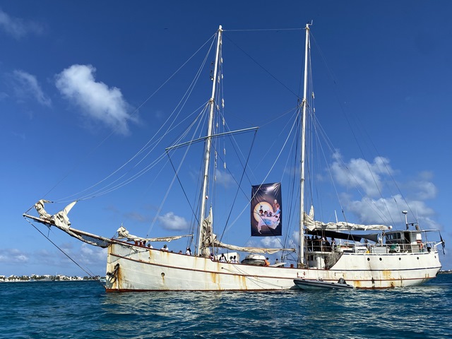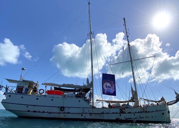 „weit weg von dem Treiben/und der falschen Gesellschaft“. Um es herum flatterten Lachmöwen, Kormorane, Fregattvögel, Ohrensittiche, Korallenvögel und sogar ein verirrter Kolibri wollte in der Bugkanzel sein Nest machen. Im Rumpf, unterhalb der Wasserlinie, trommelten Flaschendelfine eine Cumbia, ein Walhai machte den Rhythmus mit seinen Flossen und der Mantarochen breitete seine schwarzen Flügel wie fliegende Fahnen aus.