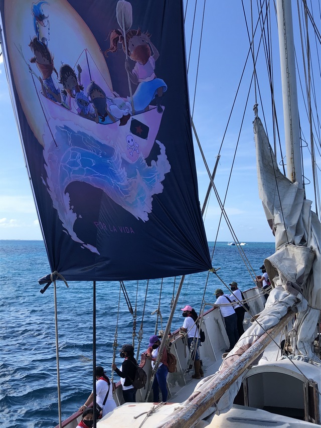 Es gab keinen Widerstand von der Besatzung. Tatsächlich hatte der Kapitän befohlen, ein großes Banner mit dem Bild, das die zapatistische Seedelegation kennzeichnet, als Signal zu hissen und damit die La Montaña, einschließlich der gesamten Besatzung, in den Kampf um das Leben einzubeziehen. Mit der kahlen Takelage leuchtete das Symbol des zapatistischen Deliriums noch heller und ungestümer.
