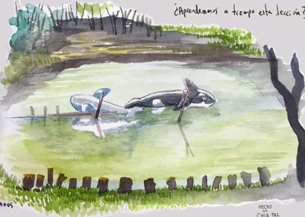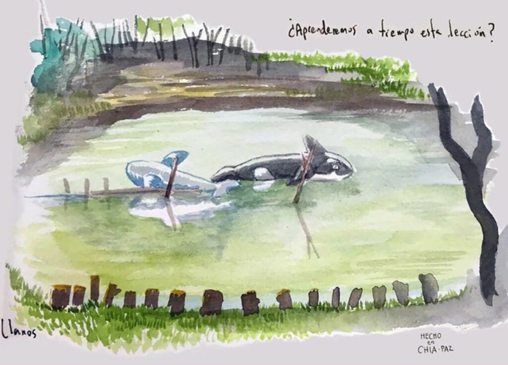 Und während er mit dem Gato-Perro den Donut teilt, erzählt er ihm eine wundervoll-schreckliche Geschichte von einem Mädchen, das sich Calamidad Zapatista – Zapatistischer Unglücksrabe nennt – und die zum Unglück der beiden in diesem Augenblick in der Champa mit dem Ton-Mischpult der Tercios Compas (*18) auftaucht. Sie sagt nur: »Spielen wir?« – während sie sich dem See zuwendet, um die Anlage ins Wasser zu werfen – dort wo einige Ballenoas, Wal*innen glücklich hoch springen, weil sie wahrgenommen werden.